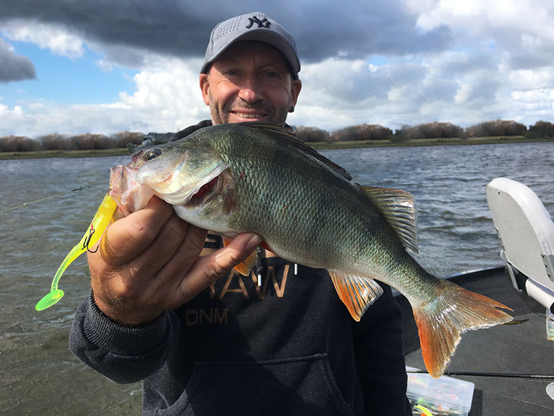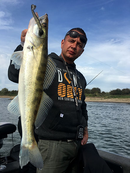 Wie schon beim letzten mal, hatte ich auch diesmal wieder einen absoluten Neueinsteiger zu Gast. Und nach einer kurzen Einweisung begann für Ihn die Reise in die Vertikale-Galaxy. Das Wetter spielte mit und strahlender Sonnenschein sollte den ganzen Tag über unser stetiger Begleiter sein. Was Anfangs noch recht zäh begann, sollte später in einer wahren Beissorgie enden. Den ganzen Tag über probierten wir sämtliche Farben und Aktionen durch und trafen dabei immer wieder den Nerv der kampfstarken Räuber. Der Zähler pendelte sich am Ende auf 34 Fische ein und ein mitreißender Tag flog leider viel zu schnell an uns vorbei.